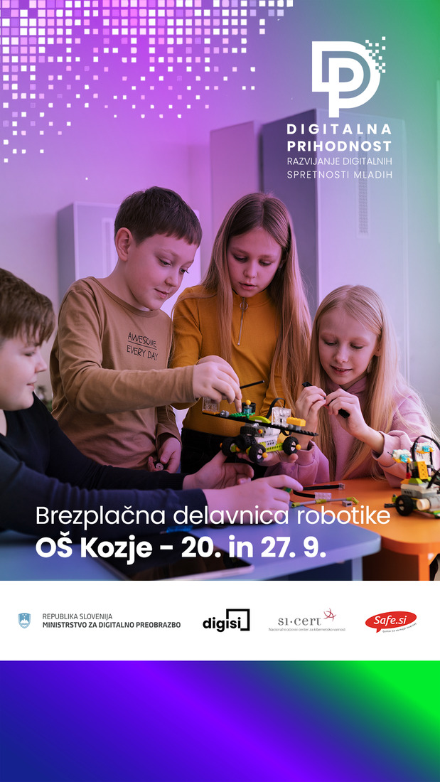 Dve zaporedni soboti v septembru, 20. in 27. septembra, med 7.00 in 16.00 bodo na OŠ Kozje potekale brezplačne dvodnevne delavnice 'Robotika in zabavno programiranje' z Lego robotskimi kompleti za osnovnošolce. Potekale bodo v dveh skupinah: mlajša skupina (Lego WeDo/Spike Essential roboti - 2.- 4. r) in starejša skupina (Lego Spike Prime roboti - 5.-9. r). Otroci bodo vsak dan dobili tudi malico in toplo kosilo. Udeležba je brezplačna, saj delavnice financira Ministrstvo za digitalno preobrazbo. Izvajalec delavnic je Razvojni center Novo mesto. Število mest na delavnicah je omejeno, zato svetujemo, da pohitite s prijavo, saj se prosta mesta kar hitro zapolnijo. Po zapolnitvi razpoložljivih mest bomo oblikovali čakalno listo.